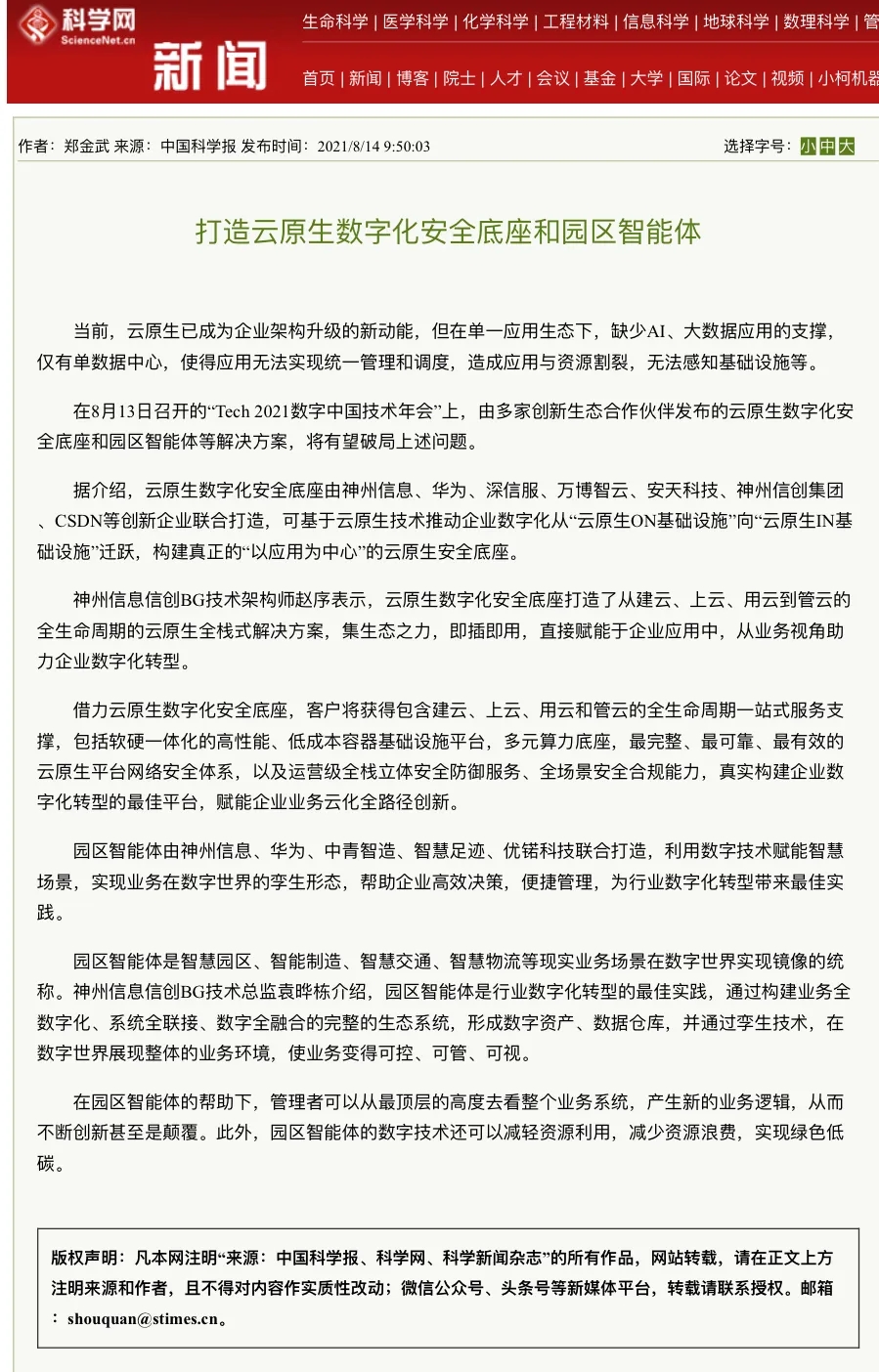 8月12日,由神州控股、神州信息、j9国际站集团联合主办的“科技自强、数据融通、场景创新——TECH数字中国 2021技术年会”云上盛大启幕,发布神州信创云、ModelB@nk5.0、金融超脑Sm@rtFSB、云原生数字化安全底座、园区智能体等重磅产品,国内各大权威、影响力媒体多角度多频次对盛况进行报道!