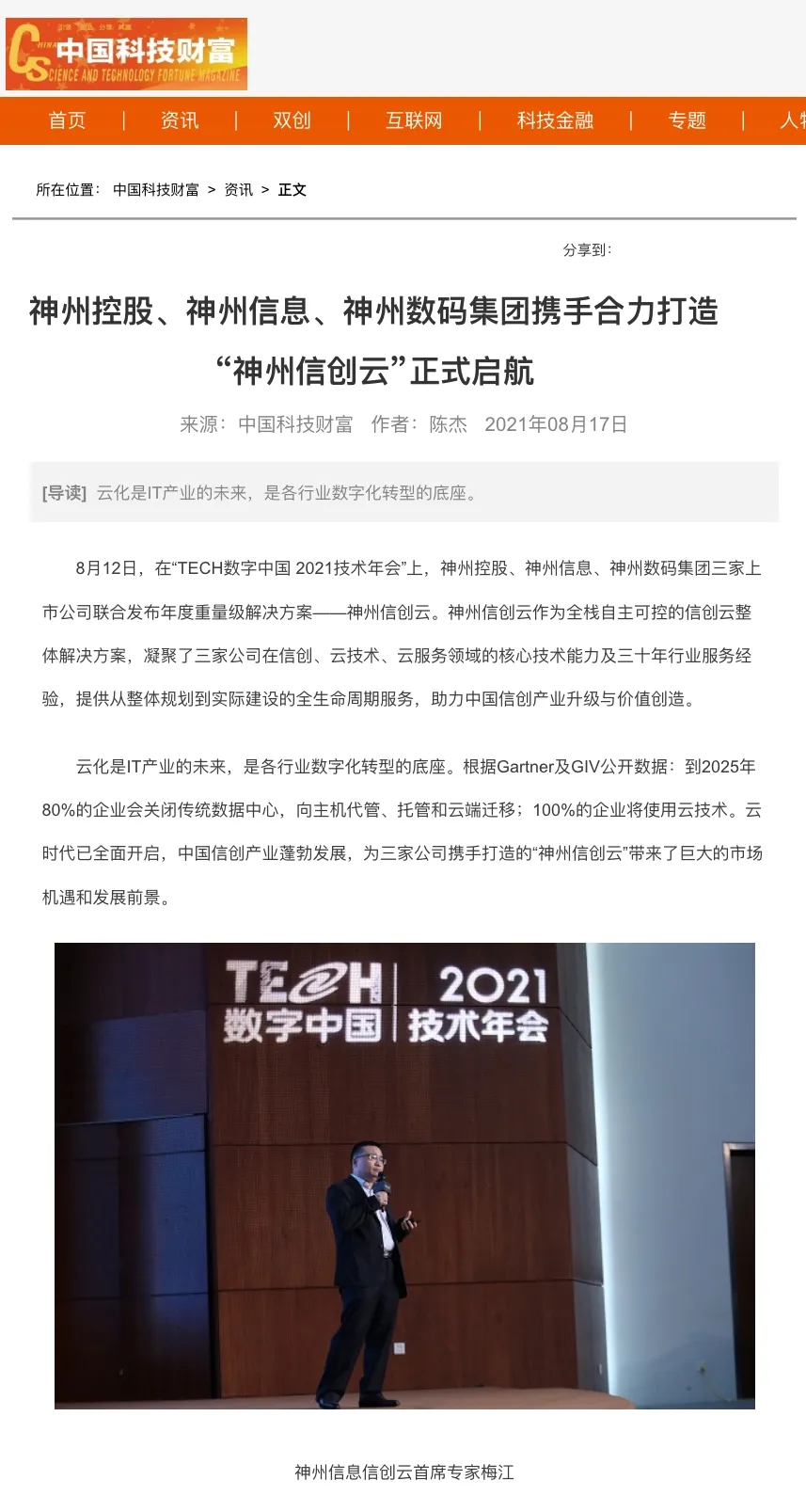 “数字中国 2021技术年会” 神州控股、神州信息、j9国际站集团联合发布 “神州信创云”
